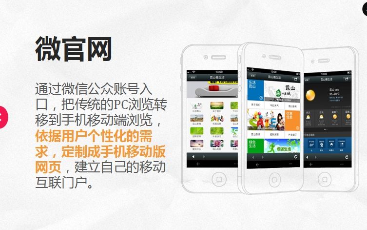 那么先來講一下這個微網(wǎng)站,其實微網(wǎng)站也就是微官網(wǎng),是在移動互聯(lián)網(wǎng)發(fā)展環(huán)境下產(chǎn)生的一種新型的webAPP和傳統(tǒng)PC網(wǎng)站結(jié)合的網(wǎng)站。它可以兼容多種智能手機的操作系統(tǒng),可以和微博、微信之間相互鏈接,是一種適用于移動端瀏覽和交互的新型網(wǎng)站類型。