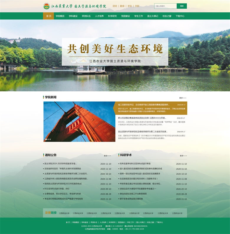 江西農(nóng)業(yè)大學(xué)國(guó)土資源與環(huán)境學(xué)院辦學(xué)歷史悠久,最早可追溯到1940年中正大學(xué)的土壤學(xué)和農(nóng)業(yè)化學(xué)學(xué)科,1997年由原資源與環(huán)境系、環(huán)保系和土管系合并而成。學(xué)院下設(shè)黨委行政辦公室、學(xué)生工作辦公室、教學(xué)管理辦公室和資料室等4個(gè)服務(wù)部門(mén),農(nóng)業(yè)資源與環(huán)境系、環(huán)境科學(xué)與工程系、農(nóng)業(yè)水利工程系、土地資源管理系和旅游管理系等5個(gè)教學(xué)單位,以及江西省鄱陽(yáng)湖流域農(nóng)業(yè)資源與生態(tài)重點(diǎn)實(shí)驗(yàn)室、南昌市景觀與環(huán)境重點(diǎn)實(shí)驗(yàn)室、江西農(nóng)業(yè)大學(xué)農(nóng)業(yè)資源與環(huán)境實(shí)驗(yàn)教學(xué)示范中心、土地資源管理實(shí)驗(yàn)室、資源環(huán)境遙感與信息實(shí)驗(yàn)室和江西農(nóng)業(yè)大學(xué)土地科學(xué)研究所等6個(gè)教學(xué)與科研平臺(tái)。 學(xué)院擁有一支初具規(guī)模、結(jié)構(gòu)合理且?guī)煹聡?yán)謹(jǐn)、學(xué)術(shù)優(yōu)良的師資隊(duì)伍。截止2017年8月,學(xué)院現(xiàn)有教職工83人,專任教師61人,其中教授15人,副教授22人,博士生導(dǎo)師6人,博士43人。全國(guó)模范教師1 人、享受?chē)?guó)務(wù)院政府特殊津貼者2人、“贛鄱英才555 工程”領(lǐng)軍人才2人、江西省優(yōu)秀教師1 人、江西省高等學(xué)校中青年學(xué)科帶頭人6人,江西省新世紀(jì)百千萬(wàn)人才工程第一、二層次人選5名。同時(shí),對(duì)外聘請(qǐng)客座和兼職教授8人。 學(xué)院在強(qiáng)化基礎(chǔ)研究和應(yīng)用基礎(chǔ)研究的基礎(chǔ)上,不斷拓展應(yīng)用研究和社會(huì)服務(wù)工作。近年來(lái),承擔(dān)國(guó)家自然科學(xué)基金項(xiàng)目、國(guó)家社會(huì)科學(xué)基金項(xiàng)目、國(guó)家“973”子項(xiàng)目、“十三五”國(guó)家重點(diǎn)研發(fā)計(jì)劃項(xiàng)目、省部級(jí)及市(廳)級(jí)各類課題318項(xiàng),發(fā)表論文346篇,出版著作16部,獲國(guó)家級(jí)、省部級(jí)等科技獎(jiǎng)勵(lì)23項(xiàng),獲專利8項(xiàng),其中一大批科技成果在社會(huì)上得以廣泛應(yīng)用,取得良好的經(jīng)濟(jì)效益、社會(huì)效益和生態(tài)效益。 雅騰科技根據(jù)學(xué)院的具體需求,進(jìn)行量身定制設(shè)計(jì)、采用寬屏布局、簡(jiǎn)潔、大氣、上檔次。 (江西農(nóng)業(yè)大學(xué)國(guó)土資源與環(huán)境學(xué)院網(wǎng)站首頁(yè)設(shè)計(jì)效果圖) 雅騰科技專注企業(yè)網(wǎng)站建設(shè)、微信小程序、軟件系統(tǒng)、公眾號(hào)定制開(kāi)發(fā),有專業(yè)的技術(shù)團(tuán)隊(duì),為企業(yè)提供高性價(jià)比的技術(shù)開(kāi)發(fā)支持服務(wù)。